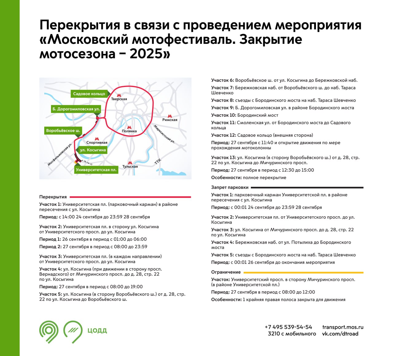 Также с 24 до 28 сентября запрещена парковка на Университетской площади в районе пересечения с улицей Косыгина. С 00:01 26 сентября до окончания мероприятия парковку запретят на Университетской площади от Университетского проспекта до улицы Косыгина и на участках улицы Косыгина, Бережковской набережной и съездах с Бородинского моста на набережную Тараса Шевченко.