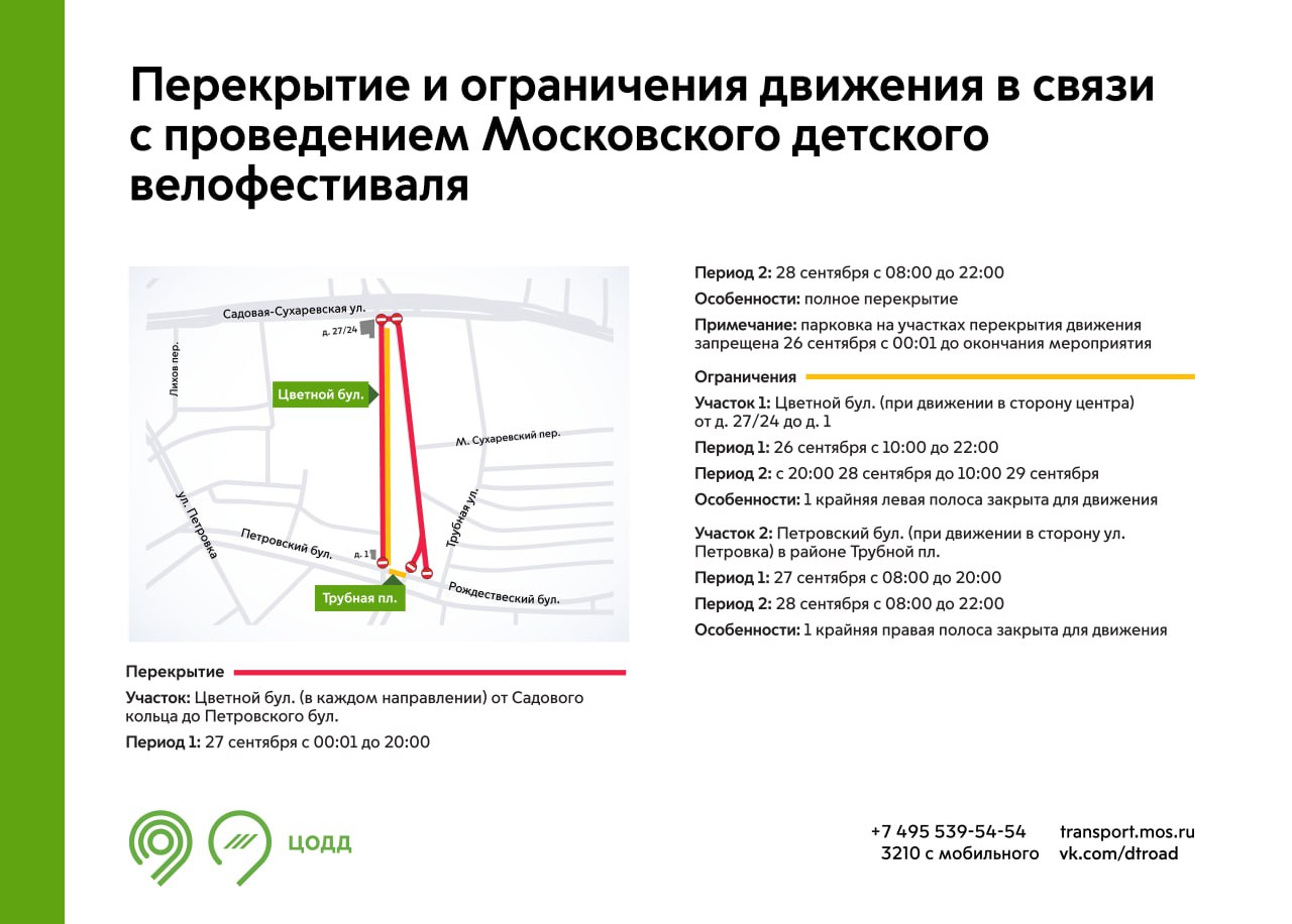 Также в период с 26 до 28 сентября на участках Цветного и Петровского бульваров будет недоступна для движения 1 полоса.