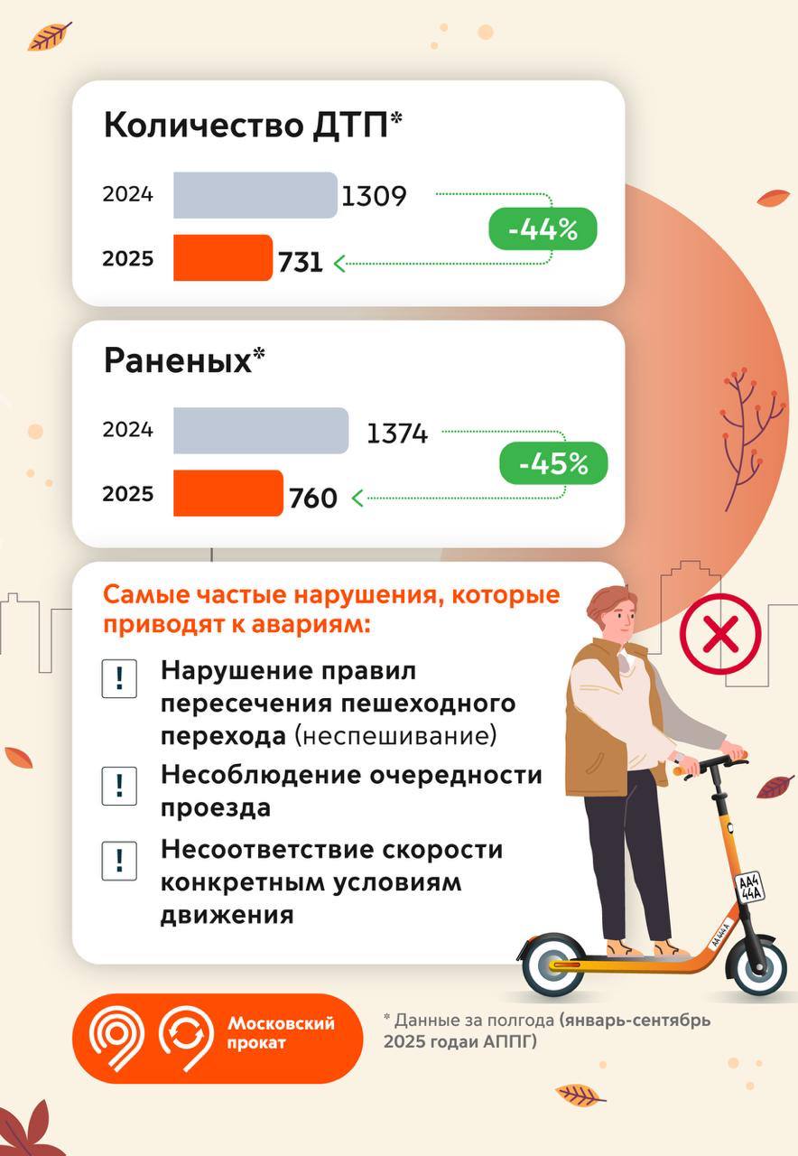 Максим Ликсутов сообщил, что за 9 месяцев число аварий с участием СИМ в Москве снизилось на 44% по сравнению с аналогичным периодом прошлого года. При этом число поездок выросло на 3 млн.