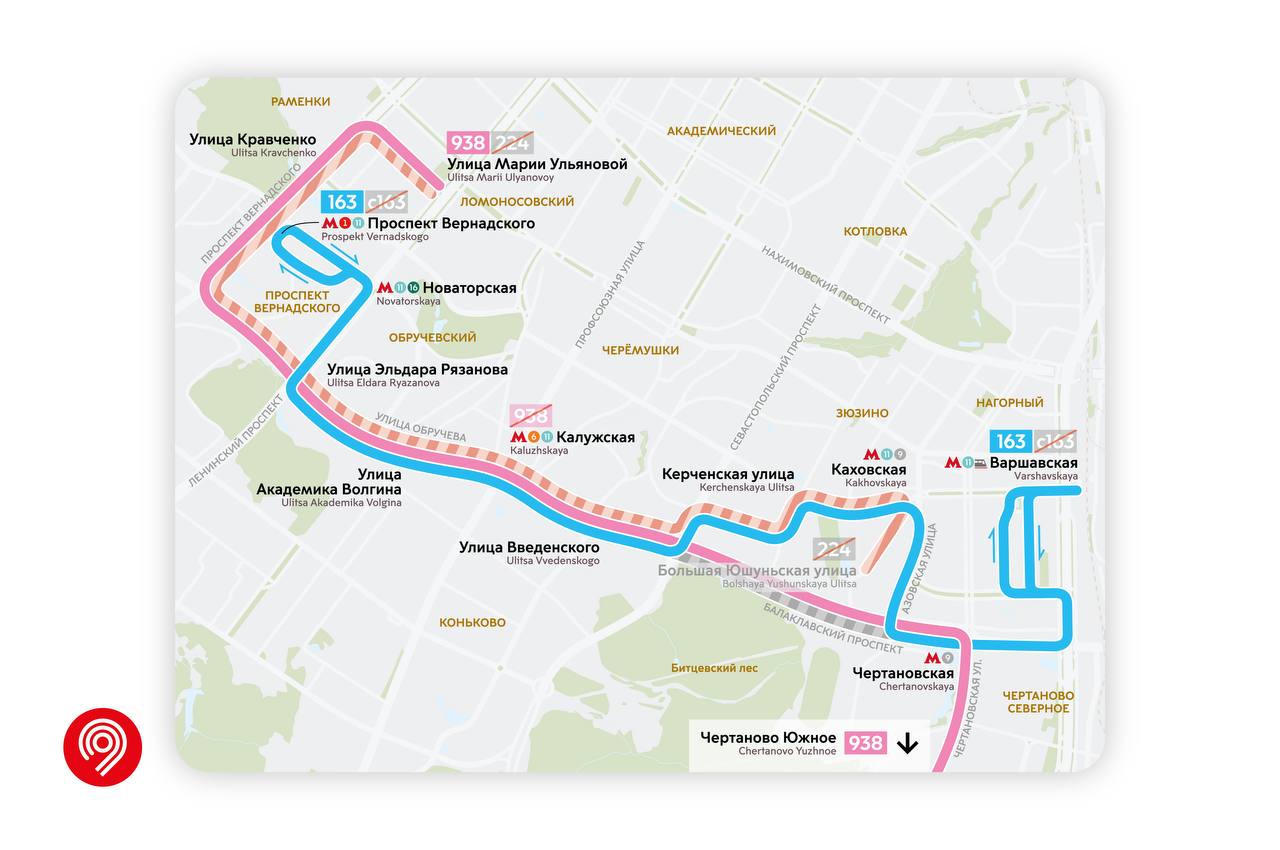 🔹 Маршрут 274 объединят с маршрутом 938. От метро «Калужская» маршрут продлили по улицам Обручева и Лобачевского, проспекту Вернадского и улице Марии Ульяновой. Жителям с улицы Обручева будет удобнее добираться до станций «Калужская» и «Воронцовская».