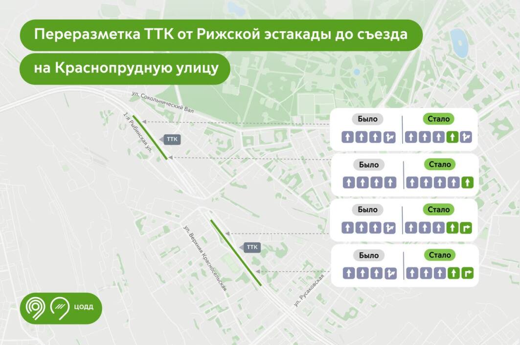 «По поручению Мэра Москвы Сергея Собянина продолжаем повышать комфорт поездок в городе. В этом году в рамках проекта ЦОДД на участке ТТК от Рижской эстакады до съезда на Краснопрудную улицу сделали несколько изменений за счет переразметки. Так, на внутренней стороне ТТК от Рижской эстакады до Митьковского тоннеля добавили полосу движения. Кроме того, съезд на улицу Гаврикова теперь возможен с двух полос. Благодаря этим улучшениям пропускная способность участка на внутренней стороне выросла на 20%, а безопасность движения повысилась: несколько выездов обустроили переходно-скоростными прикрытыми полосами», – отметил Максим Ликсутов.