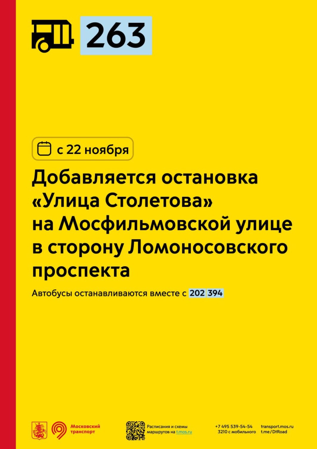 С 22 ноября для маршрута 263 добавляется остановка «Улица Столетова» на Мосфильмовской улице в сторону Ломоносовского проспекта