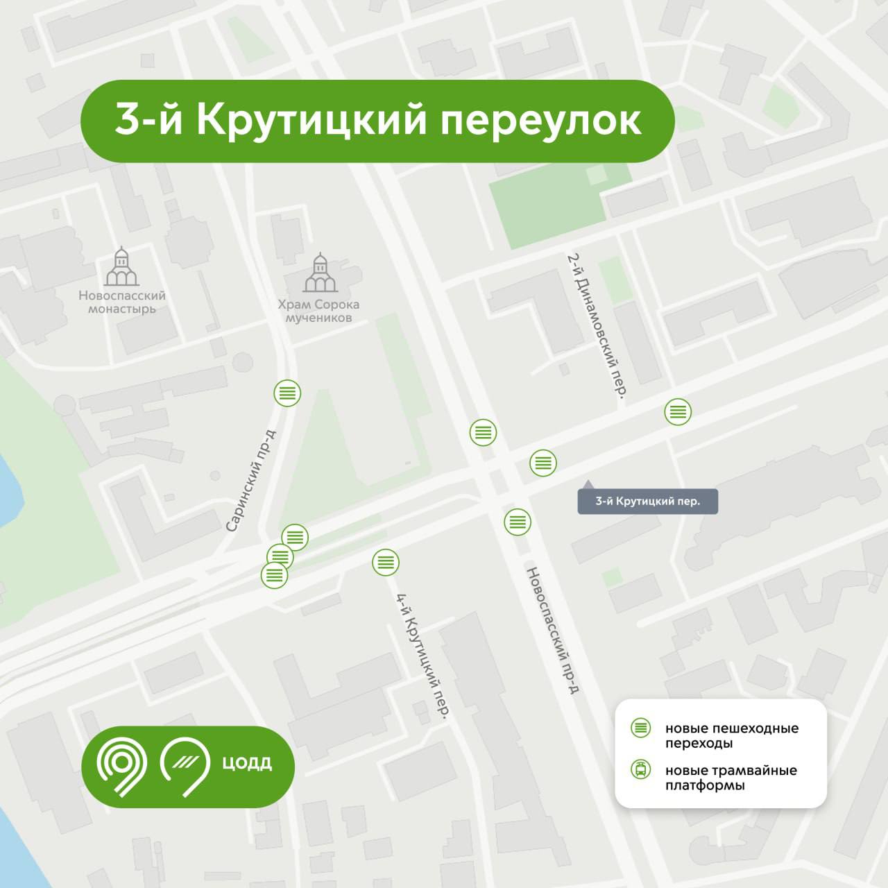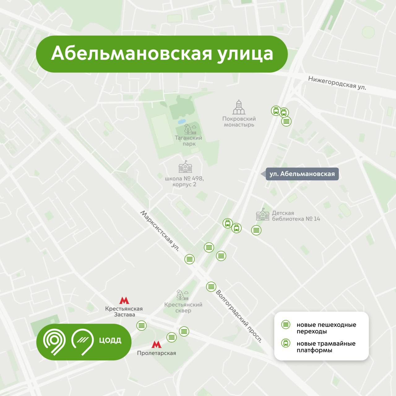 «Безопасность на дорогах — наш основной приоритет в соответствии со Стратегией развития транспорта до 2030 года, которую утвердил Мэр Москвы Сергей Собянин. Продолжаем делать город комфортнее для всех участников движения. Так, по транспортной схеме ЦОДД в рамках благоустройства на Абельмановской улице и в 3-м Крутицком переулке добавили 18 новых пешеходных переходов и 4 новые трамвайные платформы», — рассказал Максим Ликсутов.