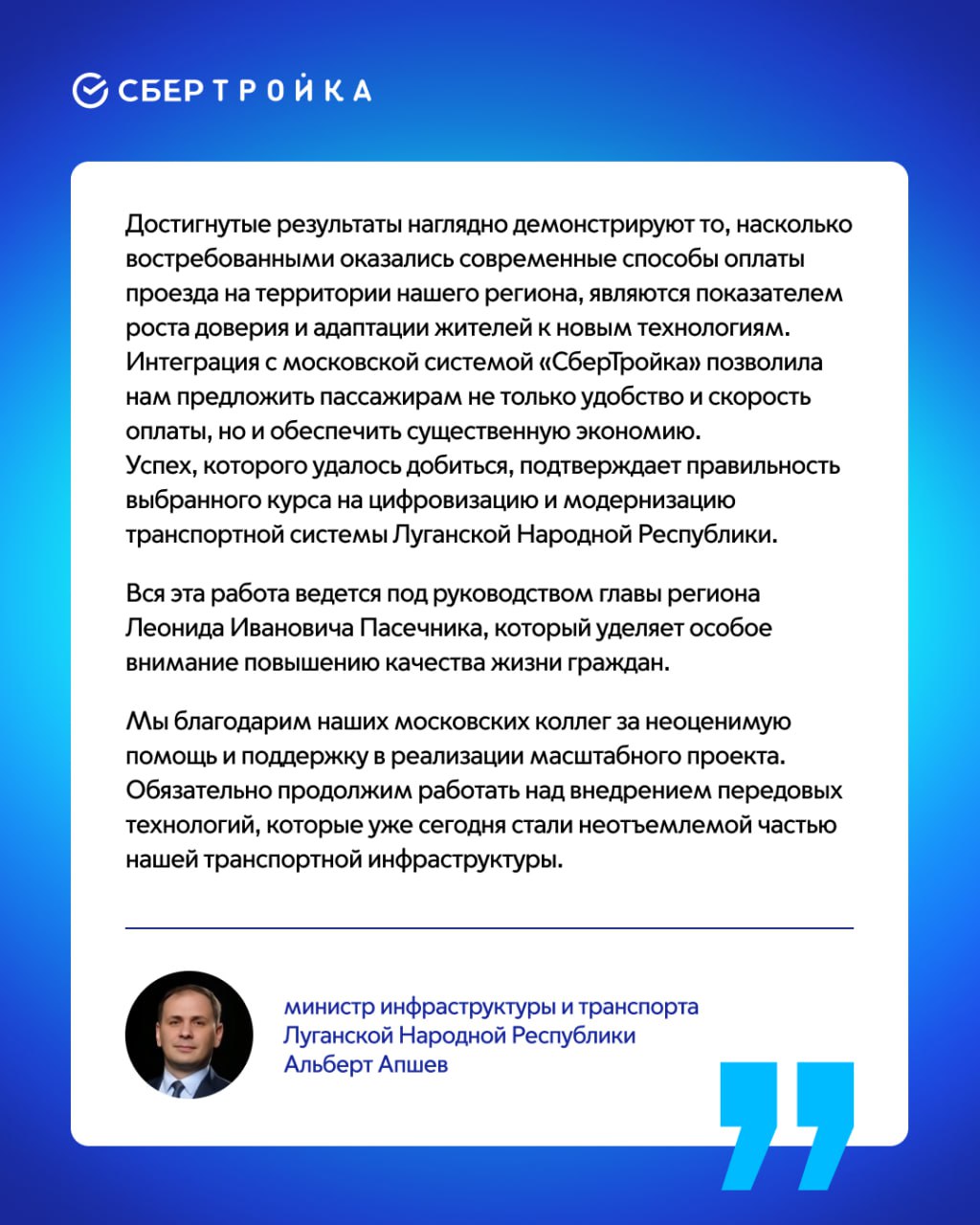 «В 2022 году Мэр Москвы Сергей Собянин подписал соглашение о сотрудничестве столицы и Луганской Народной Республики. Мы активно участвуем в модернизации транспортной инфраструктуры региона: успешно интегрировали транспортную систему с московской билетной системой «СберТройка», передали 120 современных автобусов и 2 электробуса вместе с зарядной станцией, а также порядка 90 комфортных остановочных павильонов. Уверен, что передовые решения и инновационные технологии столицы повысят комфорт и удобство пассажиров республики. Благодарим власти региона и лично главу республики Леонида Пасечника за активное сотрудничество и стремление совершенствовать транспортную инфраструктуру нашей страны», — сказал заместитель Мэра Москвы по вопросам транспорта и промышленности Максим Ликсутов.