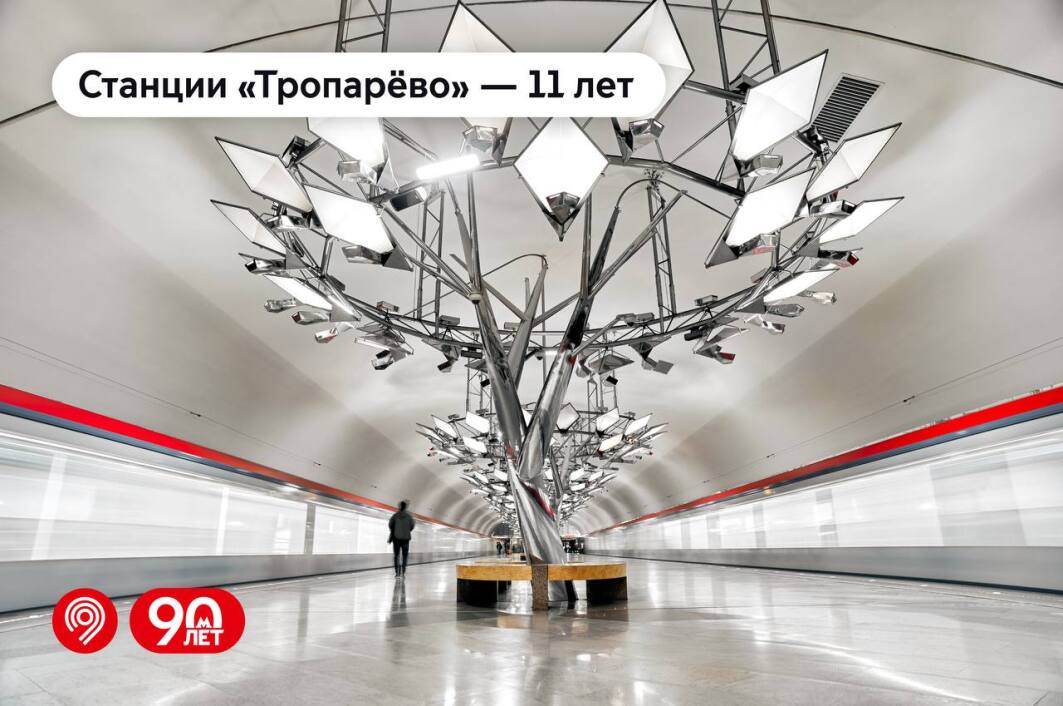 🔹 «Тропарёво» стала одной из самых светлых в московском метро: платформу освещают почти 300 ламп, вмонтированных в «листья» металлических деревьев-светильников.