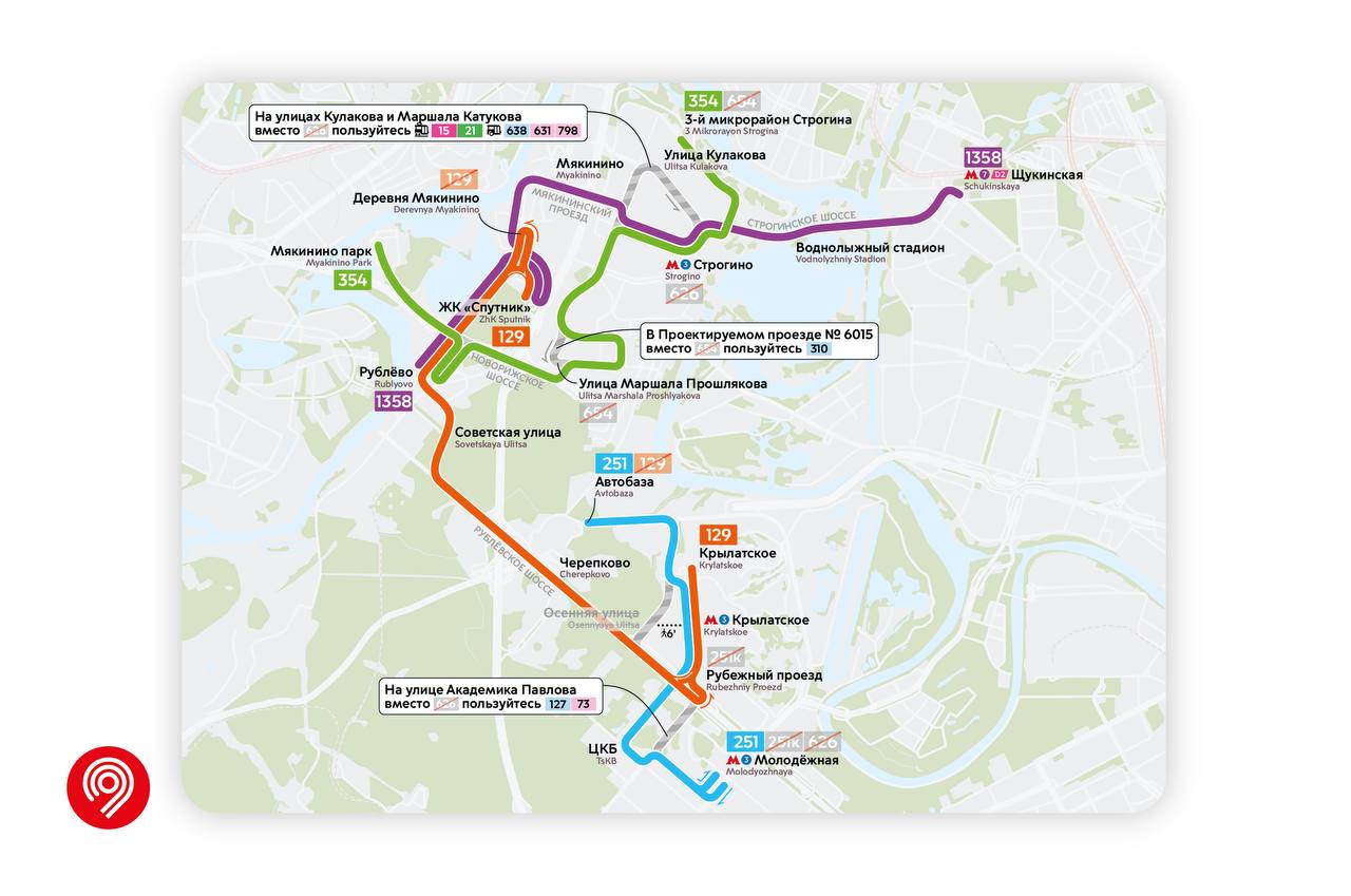 🔹 Маршрут 129 пойдет от Крылатского до ЖК «Спутник» в Красногорске с заездом в «Мякинино» в сторону Крылатского.
