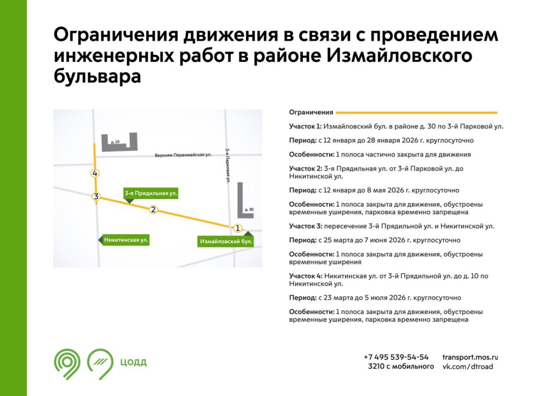 С 12 января до 5 июля 2026 г. на участках Измайловского бульвара, 3-й Прядильной и Никитинской улиц будет недоступна для движения 1 полоса