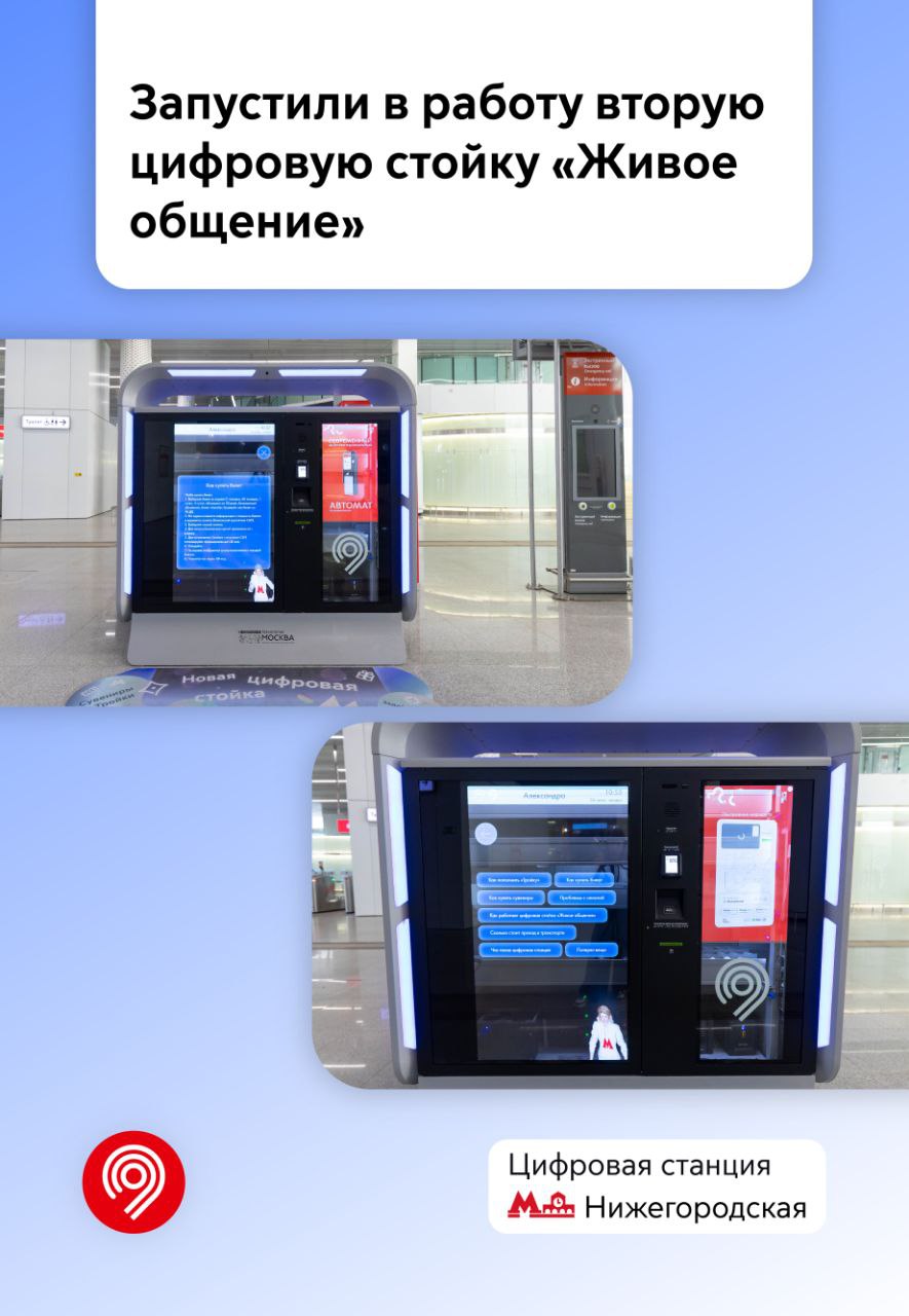 🔹 Установили 2-ю цифровую стойку «Живое общение» на транспортном хабе «Нижегородская». Благодаря ей пассажиры могут получить ответ на любой вопрос о транспорте в часы работы метро.