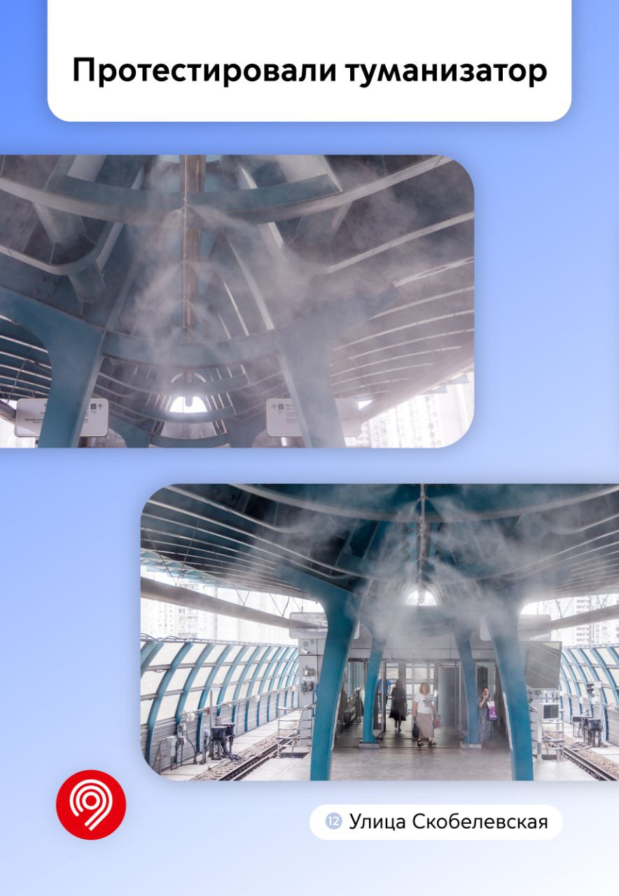 🔹 На станции «Улица Скобелевская» Бутовской линии запустили в работу туманизатор. Он распылял мельчайшие частицы воды и спасал от жары пассажиров.