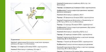 С 12 января до 30 апреля 2026 г. на участках Флотской и Сенежской улиц будет недоступна для движения 1 полоса