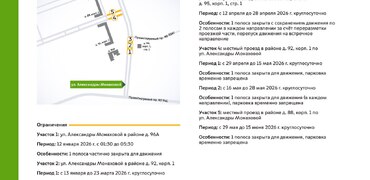 В период с 12 января до 15 июня 2026 г. на участках улицы Александры Монаховой будет недоступна для движения 1 полоса